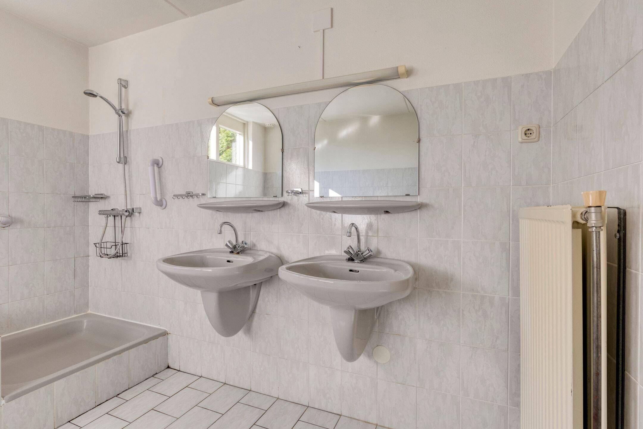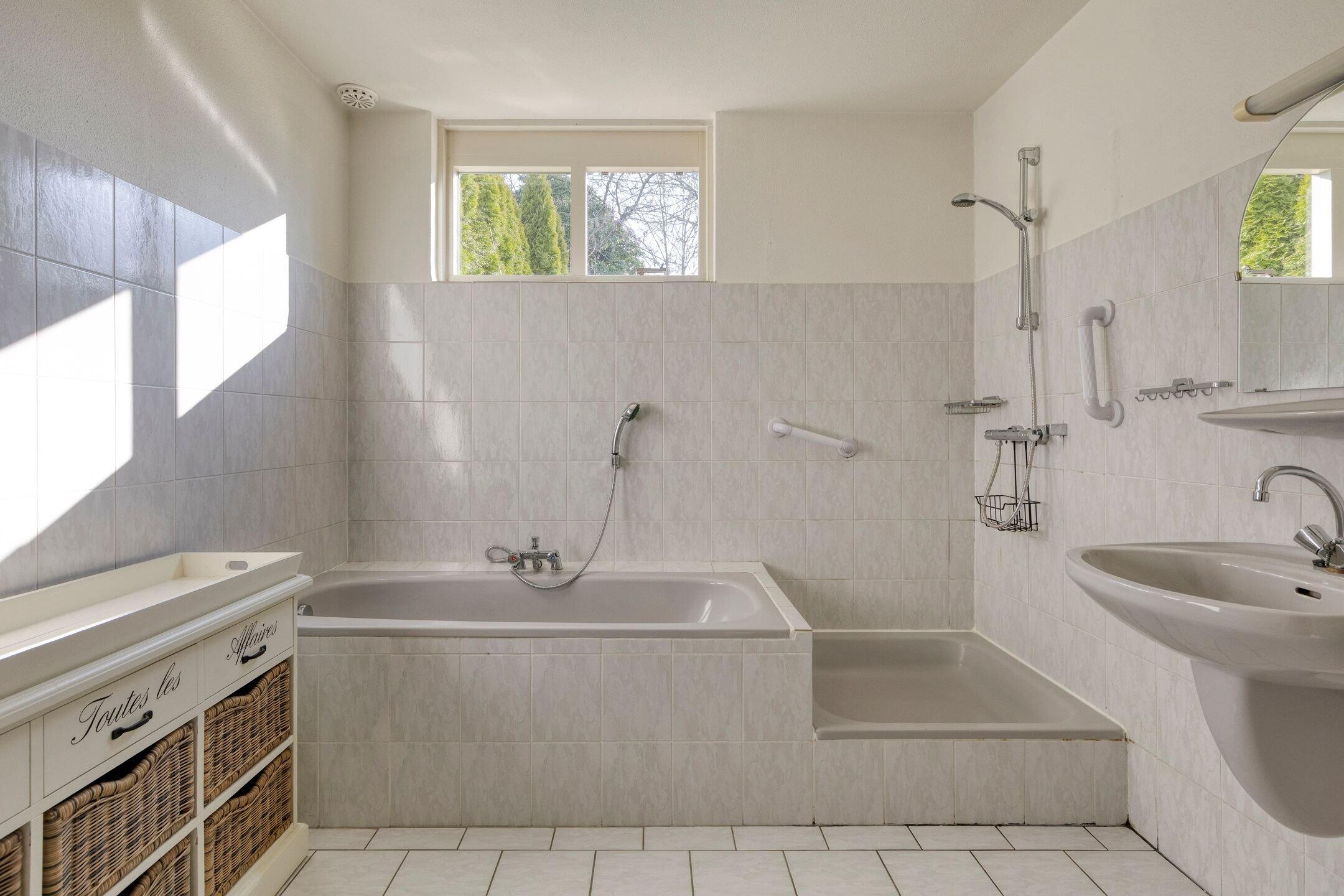 De badkamer is compleet en ruim opgezet, voorzien van een ligbad, separate douche, dubbele wastafel en toilet – een plek om volledig tot rust te komen.