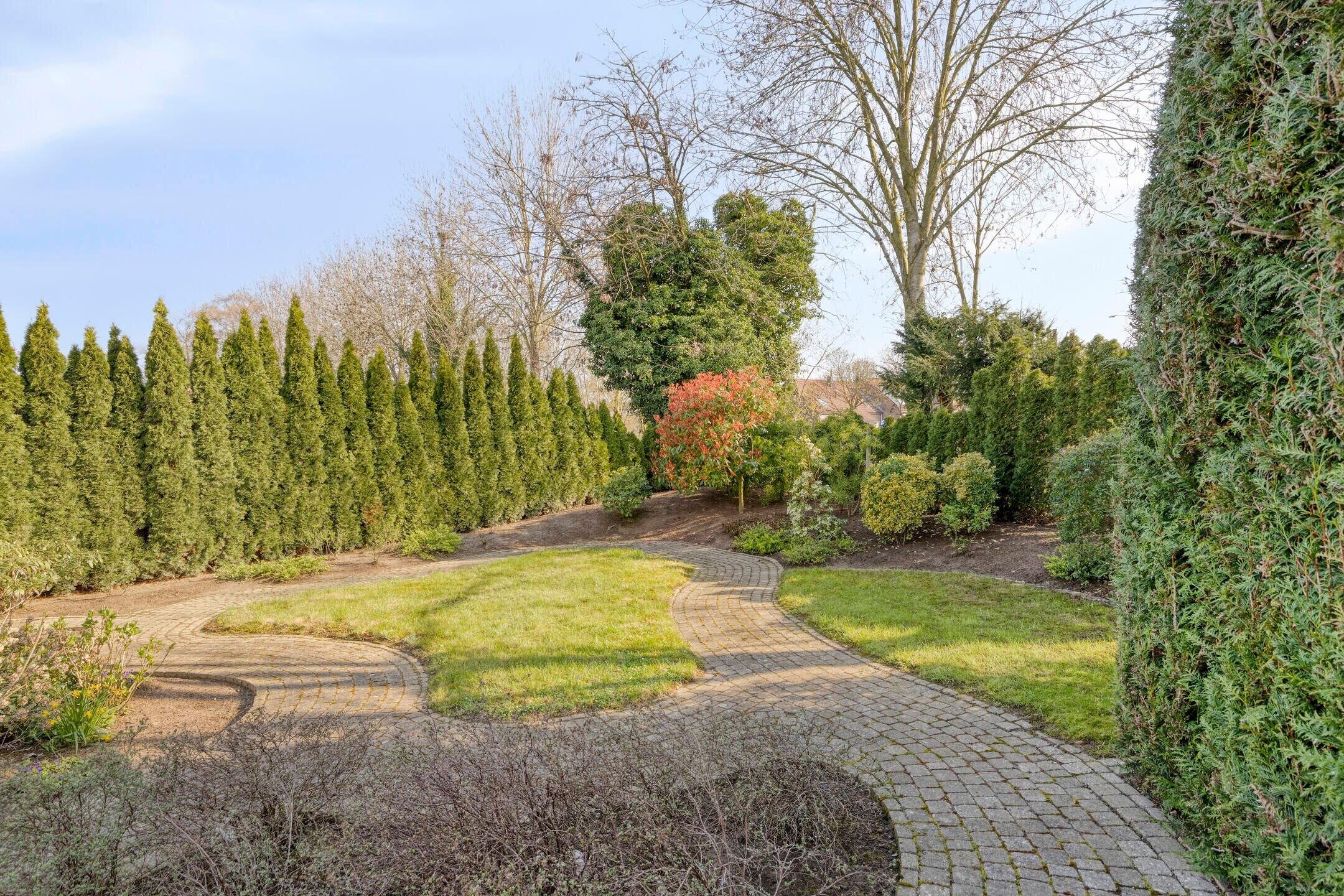 Aan de achterzijde vindt u een royaal terras met dubbele zonwering, perfect voor lange zomerdagen. De tuin is speels aangelegd met grindpartijen, sierlijke paden, een gazon en diverse borders met volwassen beplanting. De omringende dennenhaag en de karakteristieke den zorgen voor een beschutte en groene ambiance waarin u volledig tot uzelf komt.