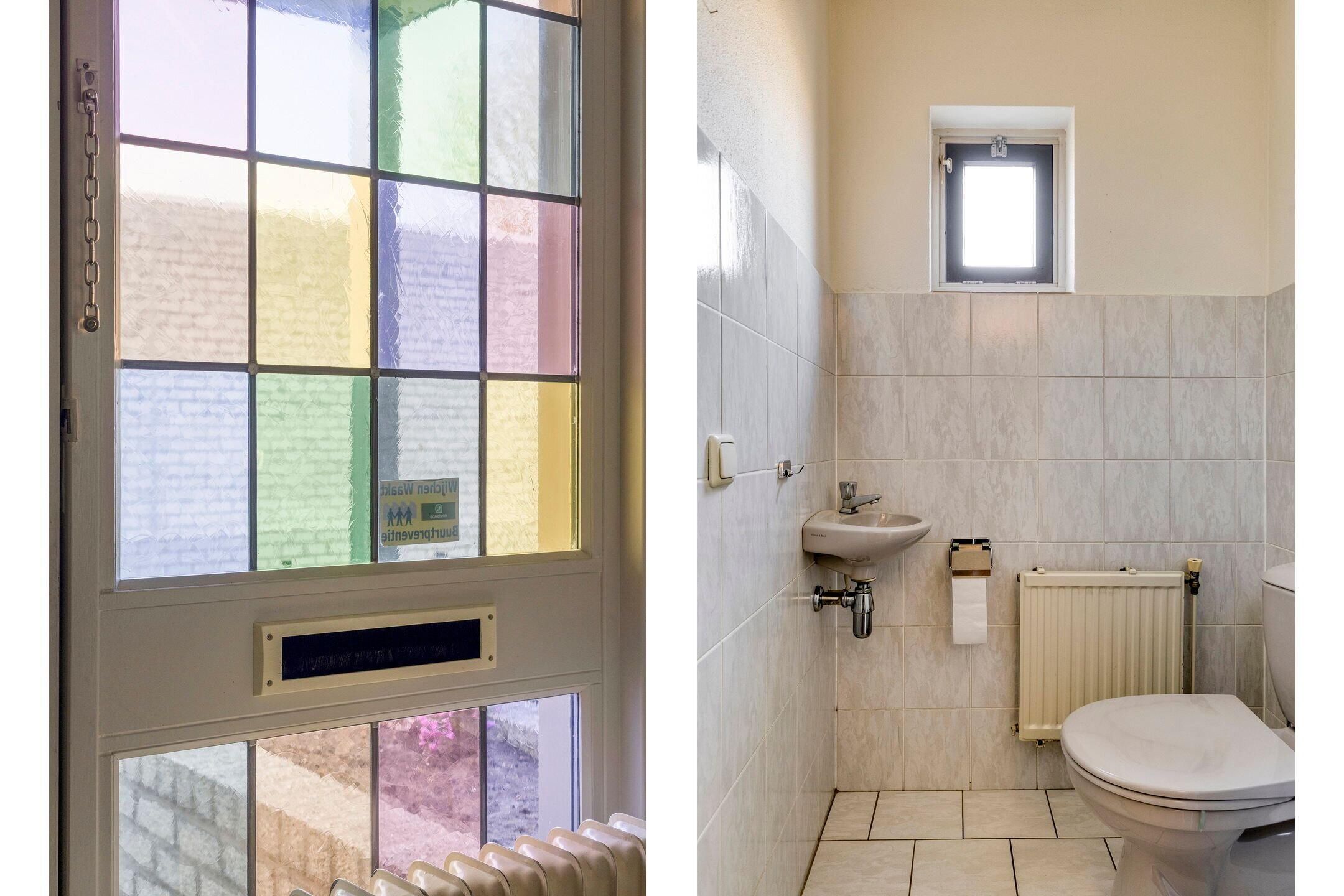Bij binnenkomst via de overkapte entree wordt u verwelkomd in een ruime hal met prachtige glas-in-lood ramen, garderobe, meterkast en een toilet met fontein.